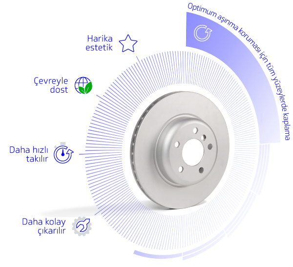 Özel bir çinko pul, gümüş Geomet kaplama, kaplamalı fren disklerimiz; hem görüntü olarak daha caziptir hem de çok sayıdaki yağa batırılmış veya kısmi olarak boyanmış ve kaplanmış eşdeğer ürünler daha fazla ve daha uzun süreli aşınma koruması sağlar. Temizleyecek yağı olmadığı için işçilik ve servis süresinde tasarruf sağlar. Takılması ve demontajı daha kolay olan ve aynı zamanda karmaşık görünmeyen daha fazla korumalı bir disktir.
