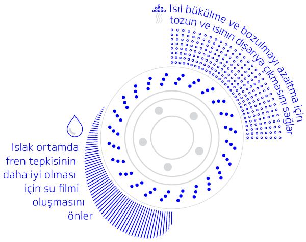 Havalandırmalı disklerimizin hava akışını maksimum seviyeye çıkaracak dahili soğutma kanalları vardır. Diskin yüzeyinden veya diskin içinden sürekli olarak hava akışının sağlanması ısının dağılmasına, hem soğutma kapasitesinin iyileşmesini ve termal şok nedeniyle çatlamaya karşı direncin artırılmasını sağlar.