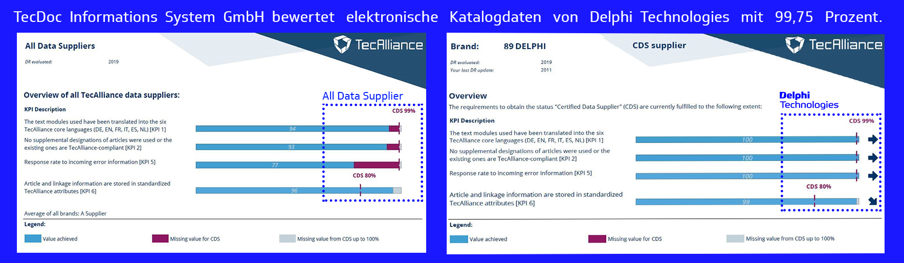 TecDoc Informations System GmbH bewertet elektronische Katalogdaten von Delphi Technologies mit 99,75 Prozent. In den vergangenen Jahren hat Delphi Technologies Datenqualität, Fahrzeugabdeckung, Sortimentsbreite und den Service für Handel und Werkstatt spürbar verbessert.