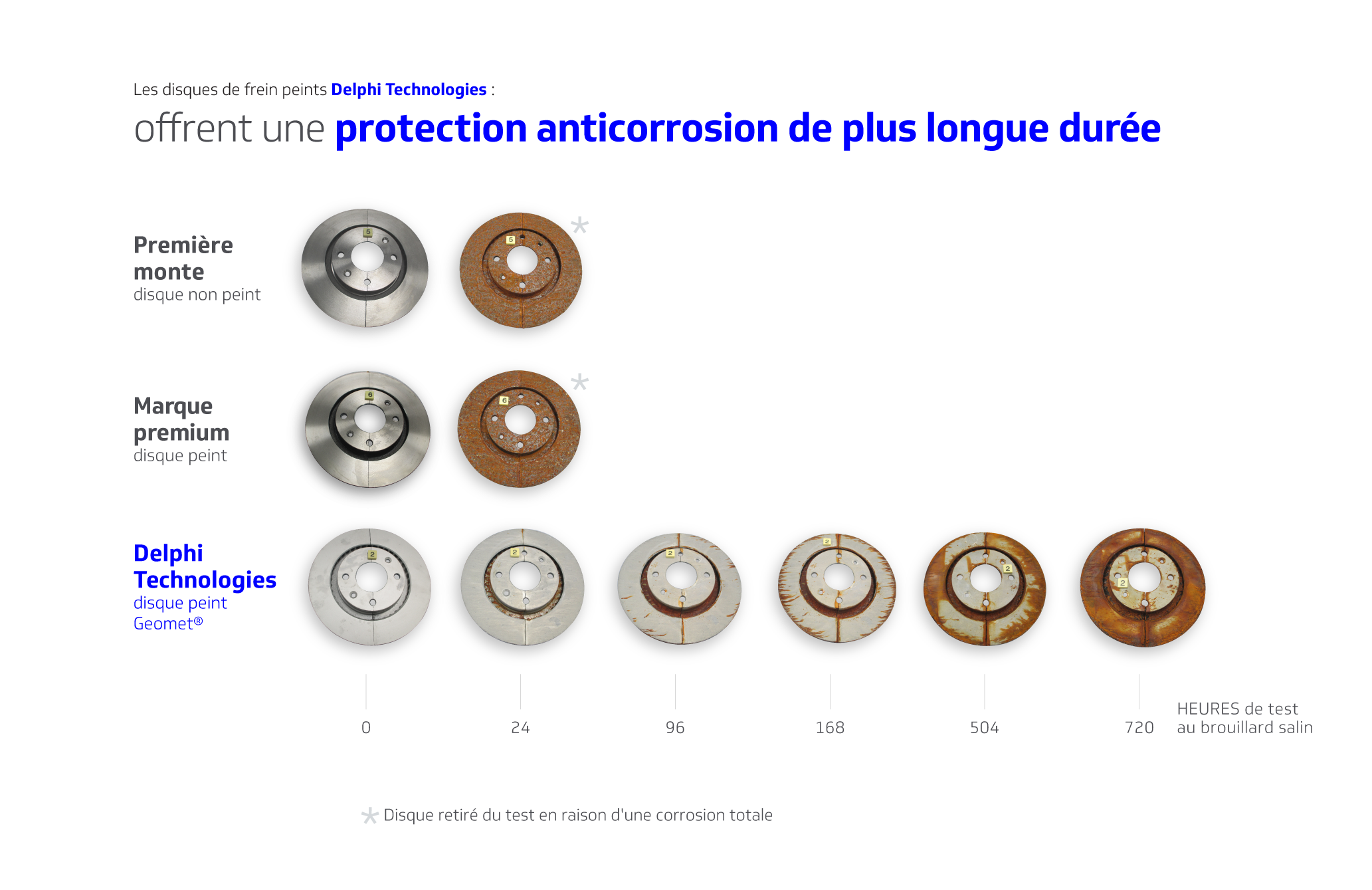 CERGY, France, 4 Juin 2019 – Delphi Technologies, fournisseur mondial de solutions sur le marché de la rechange, a démontré une fois encore les hautes performances de ses produits. Lors d’épreuves au bouillard salin réalisés par un laboratoire indépendant, les disques de frein peints Delphi Technologies ont révélé qu’ils surpassaient largement les autres en résistant 720 heures à la corrosion, contre moins de 24 heures pour les disques première monte non peints et les disques peints de marques premium équivalentes. Le revêtement de protection Geomet© utilisé par Delphi Technologies garantit ainsi un disque durable et de qualité que les professionnels peuvent installer facilement en toute confiance.