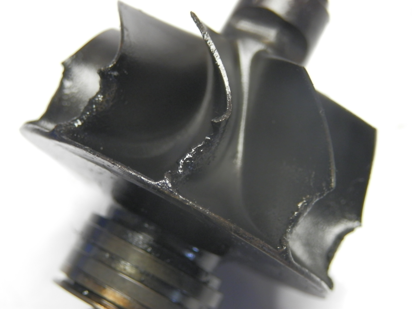 Modos de falha no turbo: Impacto de objetos estranhos | A montagem delicada dos componentes de precisão em um turbocarregador são designados especificamente para o fluxo eficiente de volumes de ar muito altos. Para fazer isso, eles precisam girar em velocidades muito altas; em um turbo moderno de alto desempenho, a montagem de roda de compressor e turbina pode girar até 240.000 rpm durante o uso, ou seja, 4.000 rotações por segundo! Nessas velocidades, até mesmo pequenos componentes possuem muita inércia (energia armazenada pronta para ser liberada). Consequentemente, o contato de qualquer partícula densa (mesmo depósitos não metálicos, como acúmulo de carbono) no funcionamento interno do turbocarregador pode causar falha total e imediata do turbo. Isso é conhecido como falha FOI (Foreign Object Impact, Impacto de um objeto estranho, em português). |